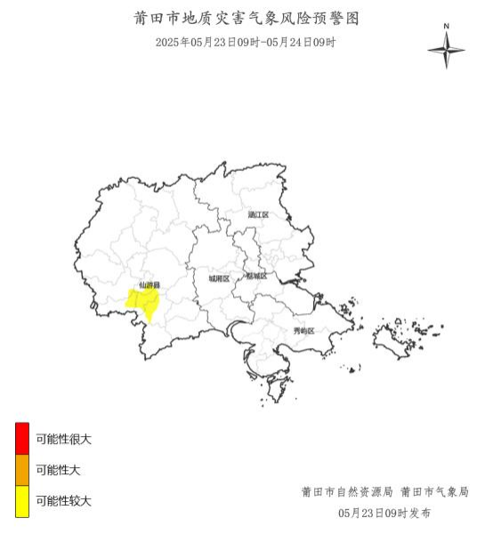 预计,05月23日09时至05月24日09时,仙游县鲤城街道、赖店镇、大济镇、龙华镇、鲤南镇,地质灾害气象风险等级为黄色预警,地质灾害发生可能性较大,应加强对地质灾害隐患点的监测和对高陡边坡、易发泥石流的沟口等易发区的巡查和防范,如果发现地灾险情应及时采取防灾避险措施,确保人民生命安全。